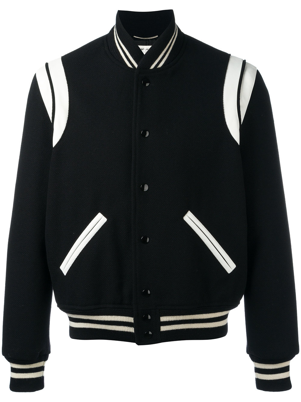 - Saint Laurent (圣罗兰) 黑色与白色 丝绸棉质羊毛小羊皮 经典棒球夹克。 罗纹衣领, 摁扣, 两个正面口袋, 长袖, 罗纹底边及袖口, 全衬里。