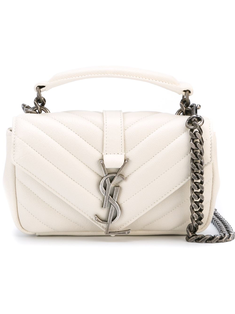 - Saint Laurent 米白色 牛皮 'College Monogram'baby斜挎包。 翻盖饰有插入式的摁扣, 正面标志贴, 绗缝效果, 顶部有一个手柄, 银色铁链肩带, 内置贴袋。