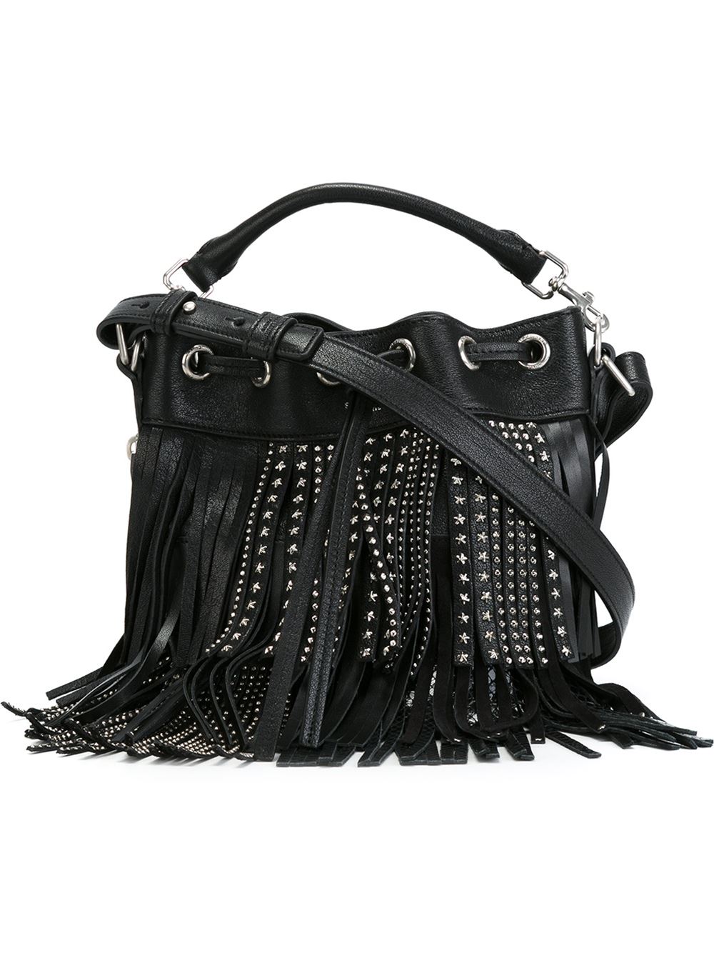 - Saint Laurent 黑色 牛皮 'Emmanuelle'小号水桶包。 抽绳系带, 可拆卸顶部手柄, 可调肩带, 银色五金配件, 流苏细节, 银色铆钉, 内置标贴。