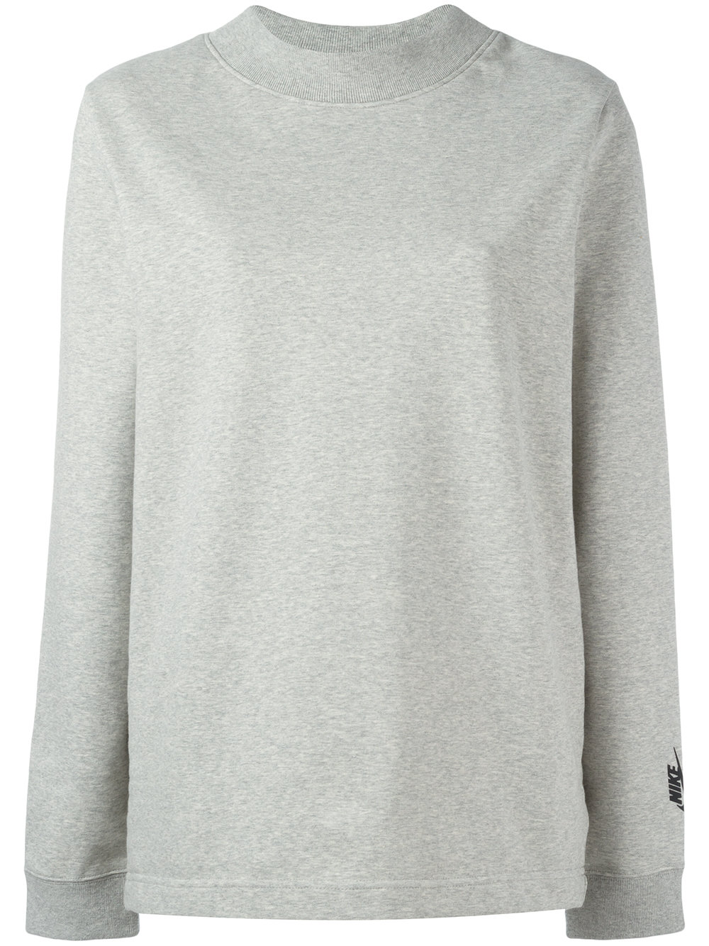 - Heather grey and black cotton blend Nikelab Essentials fleece mock neck sweatshirt from Nike featuring long sleeves, a printed logo, a loose fit and a straight hem.