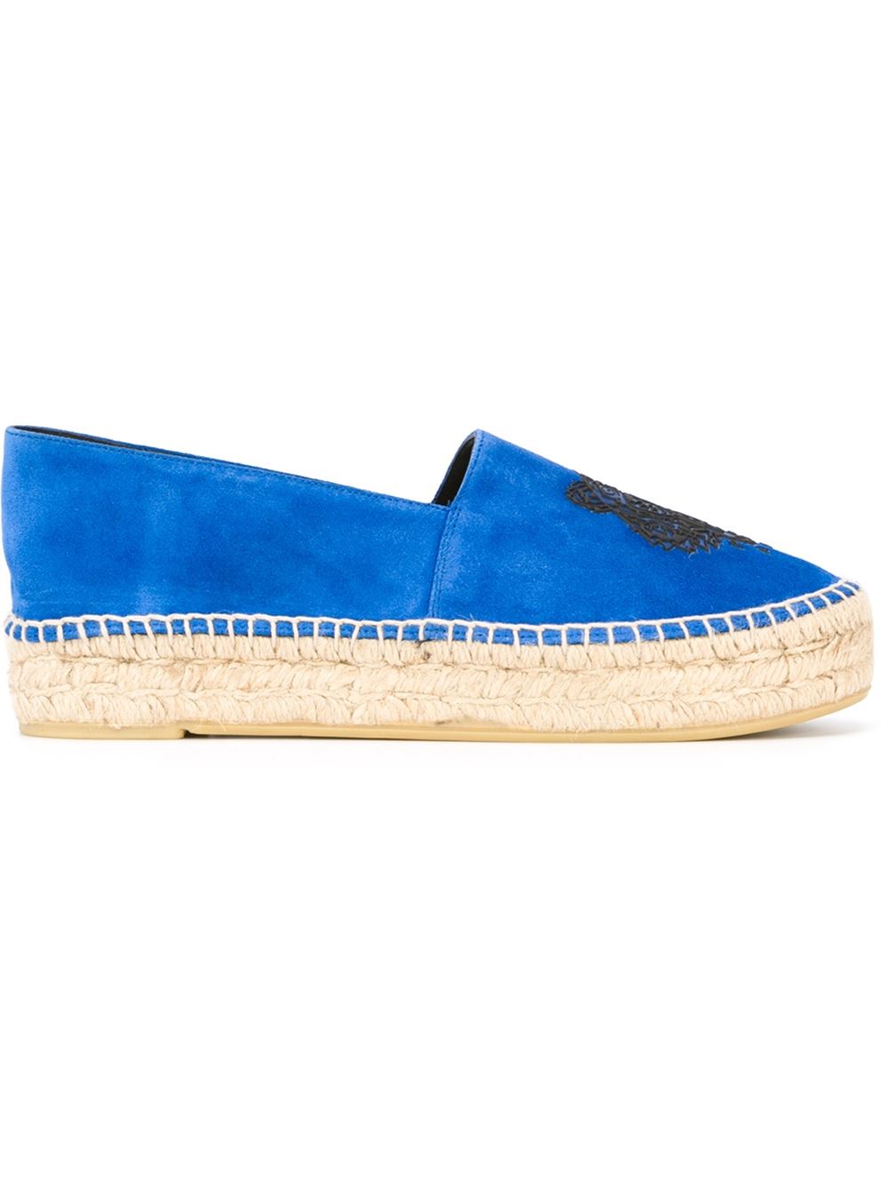 - Kenzo 蓝色 绒面皮 'Tiger'草编鞋。 圆头, 编织拉菲草质鞋底, 平底橡胶鞋底, 'Tiger'刺绣图案设计。
