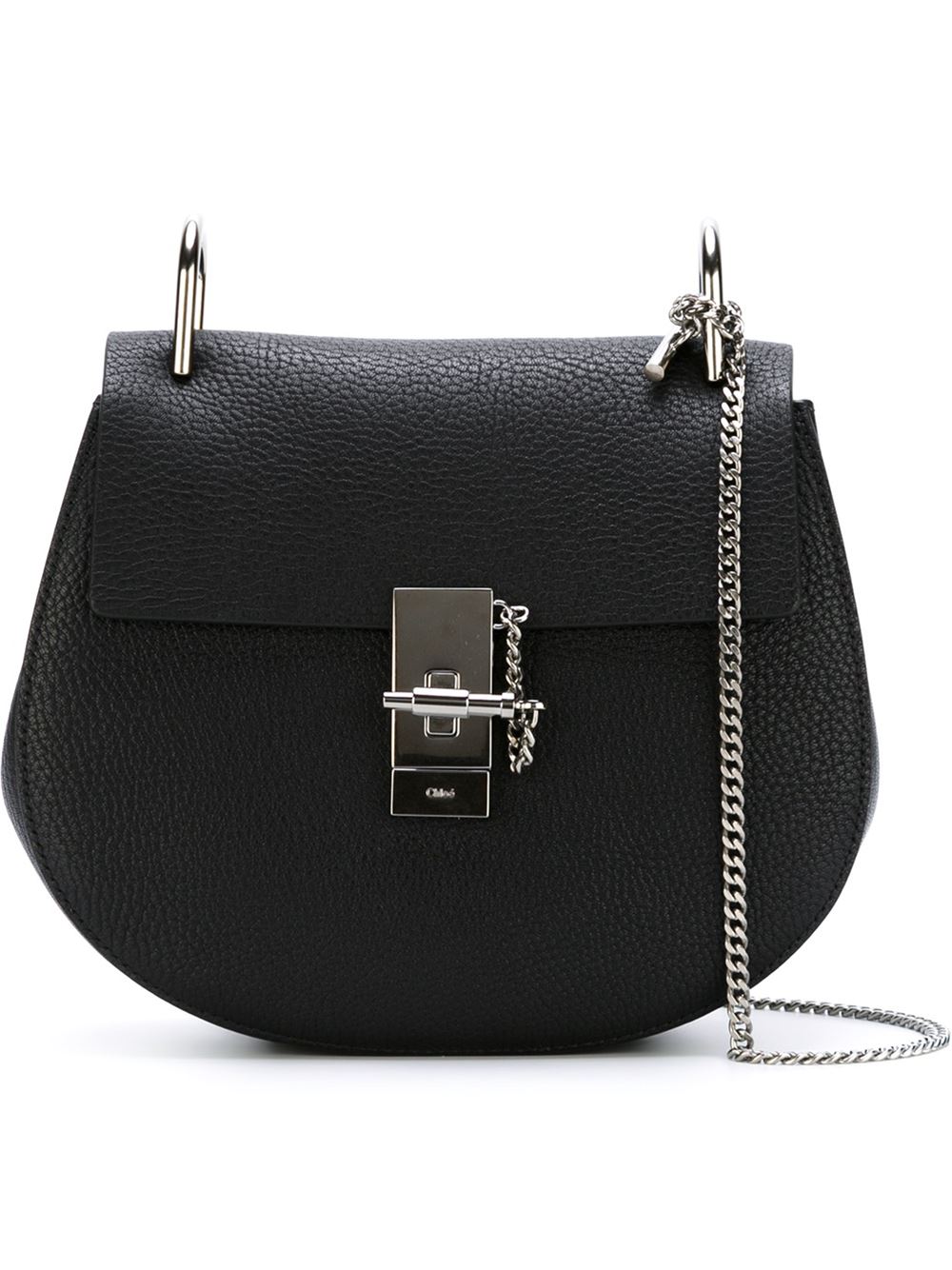 - Chloé 黑色 小羊皮 'Drew'单肩包。 翻盖饰有插入式的摁扣, 银色五金配件, 银色铁链肩带, 内置贴袋, 绒面皮衬里。