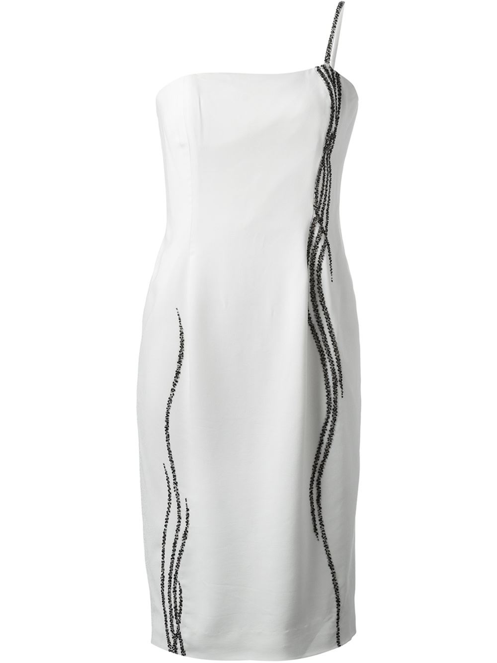 - Jean Louis Scherrer Vintage 白色 丝绸混纺 瀑布珠饰连衣裙。 单肩设计, 合身廓型, 后置隐藏式拉链, 出自1990年代。请注意,古着(vintage)商品并非新的,因此可能有轻微的瑕疵。这件商品尺码偏大,请选择小一号。