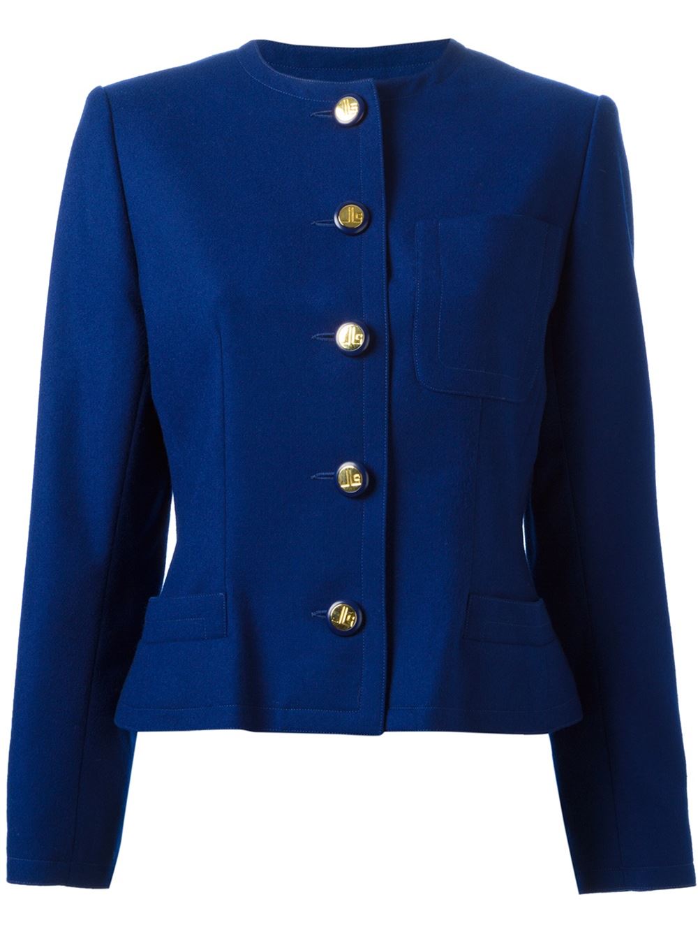 - Jean Louis Scherrer Vintage 电光蓝 羊毛 修身夹克。 圆领, 正面纽扣, 胸处饰有贴袋, 正面平袋, 胸部有针脚, 长袖, 搭扣袖口, 约莫出自1980年代。请注意,古着(vintage)商品并非新的,因此可能有轻微的瑕疵。