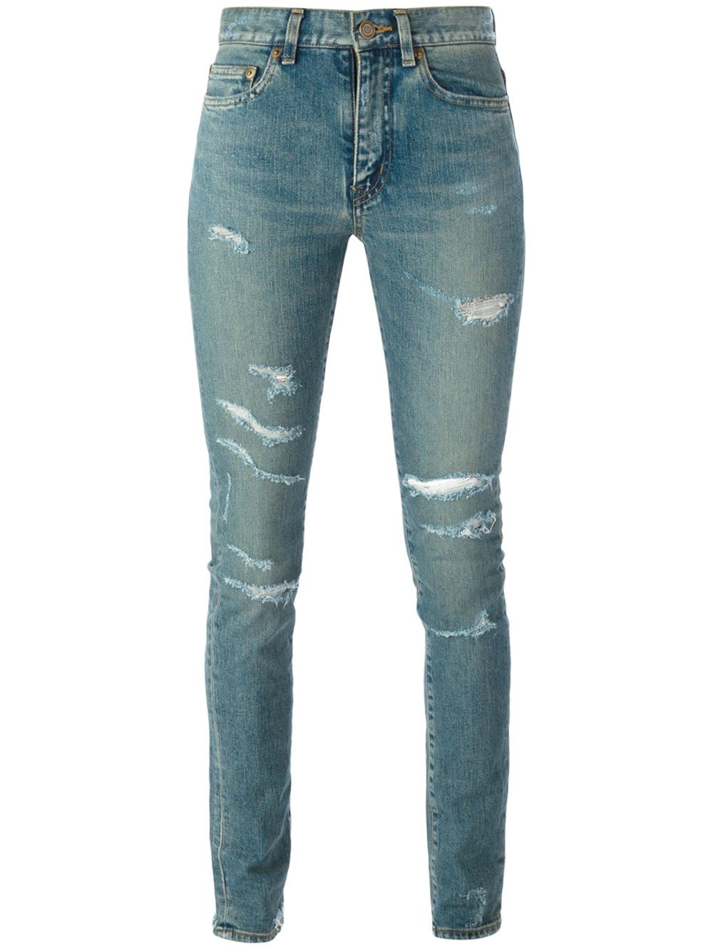 - Saint Laurent 浅蓝色 弹性棉质 仿旧紧身牛仔裤。 超窄腿, 纽扣与拉链开合, 五口袋设计, 铆钉细节, 石洗效果。