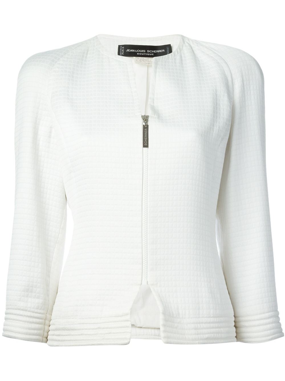 - Jean Louis Scherrer Vintage 白色 丝绸 粗质感夹克。 一字领, 正面拉链, 长袖, 罗纹底边及袖口。请注意,古着(vintage)商品并非新的,因此可能有轻微的瑕疵。
