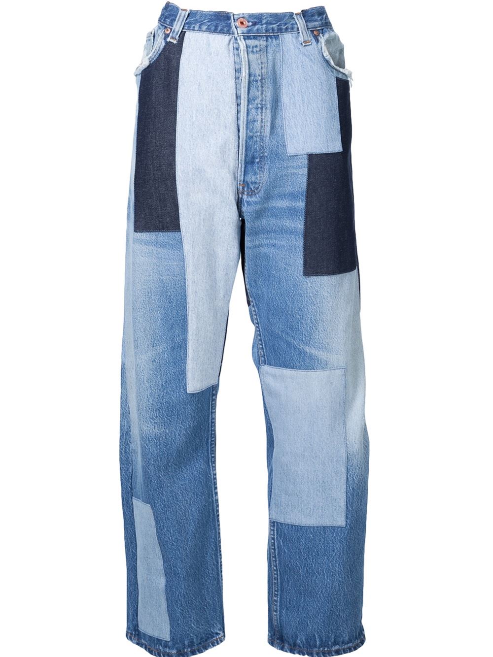- Off-White 蓝色 全棉 阔款补丁牛仔裤。