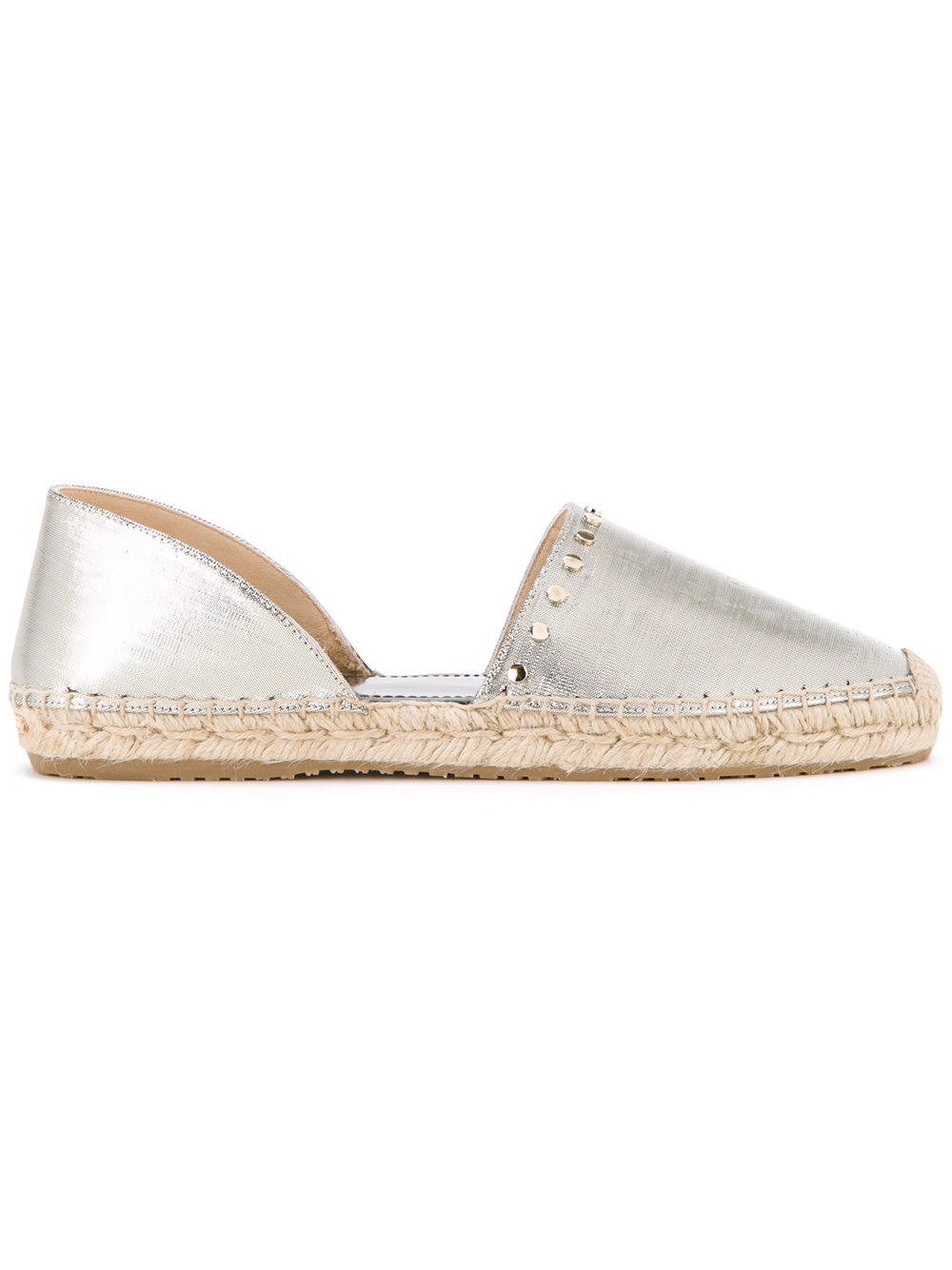 - Golden metallic cotton and canvas 'Dreya' studded espadrilles from Jimmy Choo featuring a slip-on style, a flat rubber sole and D'Orsay design.
