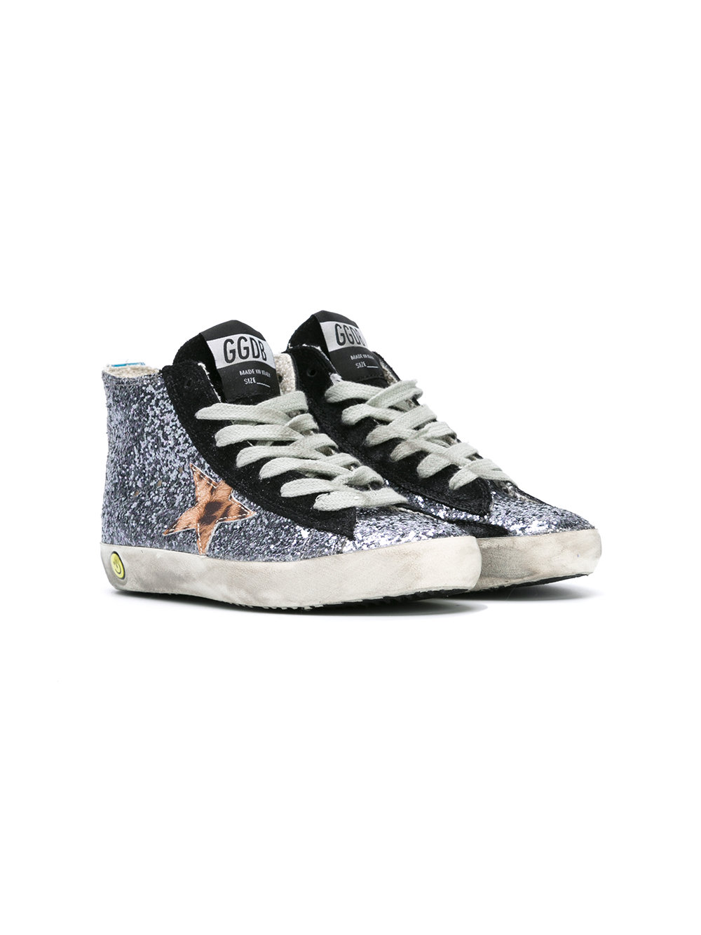 - GOLDEN GOOSE DELUXE BRAND KIDS 银色 绒面皮与全棉 亮片高帮板鞋。 圆头, 正面绑带, 鞋舌部位附有标贴, 白色橡胶质鞋底。