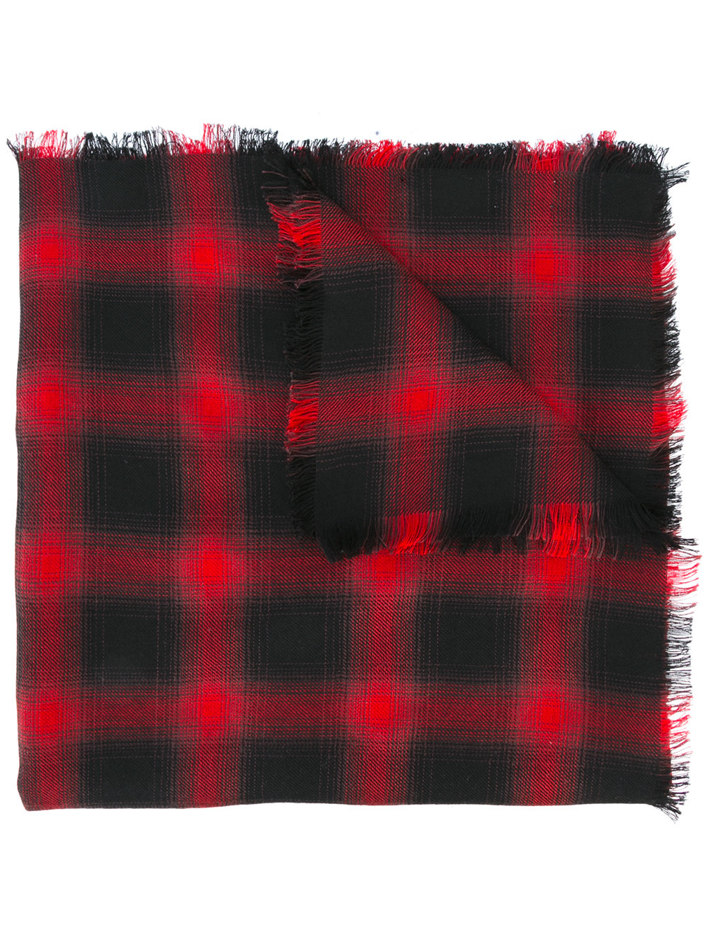 - Red and black silk-cashmere-wool raw edge checked scarf from Saint Laurent featuring fringed edges.
