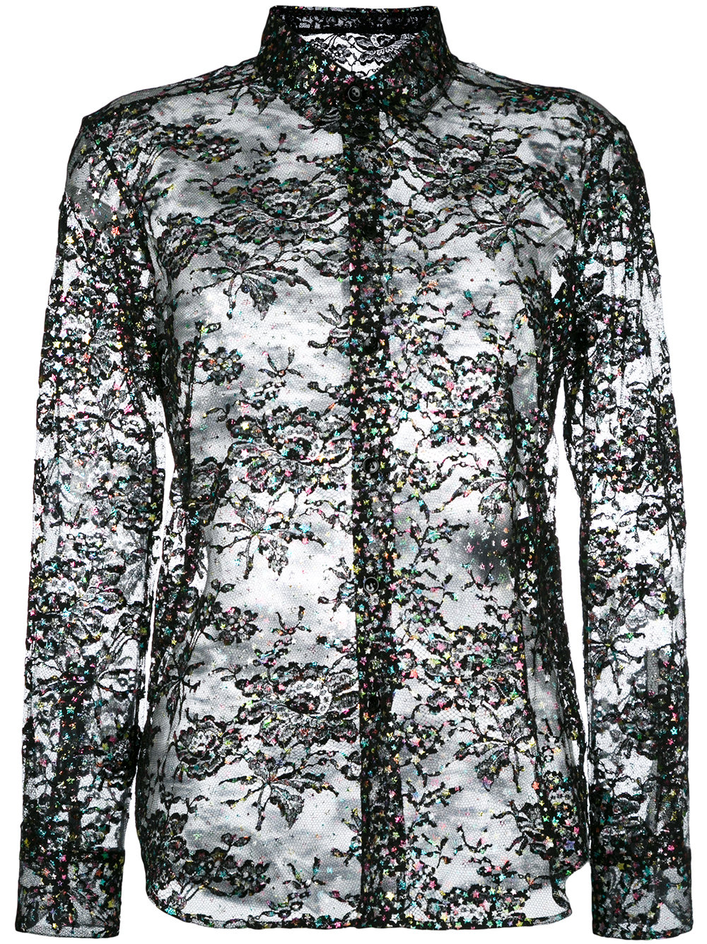 - Black cotton blend lace glitter detail top from Saint Laurent featuring a front button fastening, a sheer construction, a floral lace pattern, a classic collar and glitter star details.