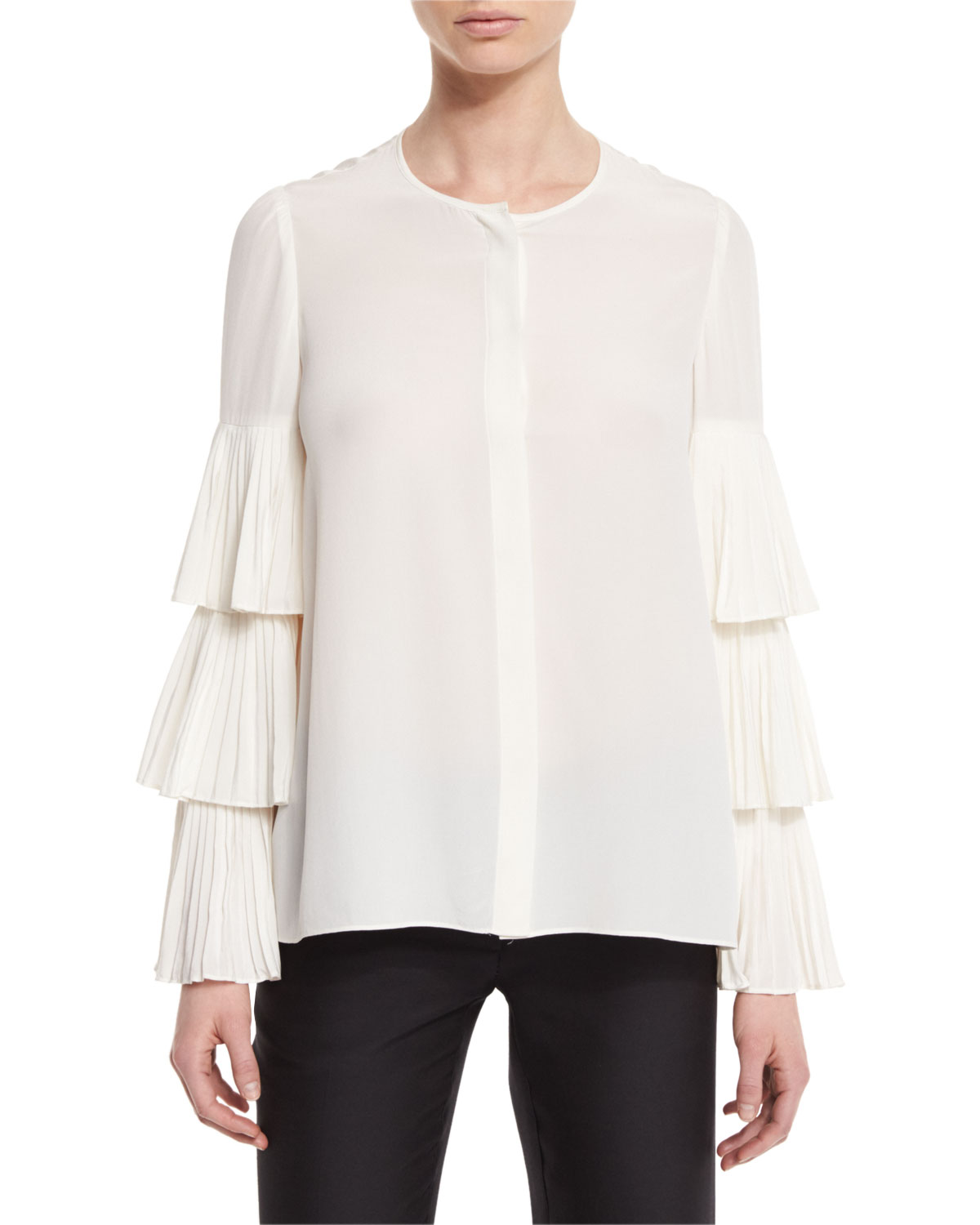 Pleated Tier-Sleeve Silk Blouse, Ivory