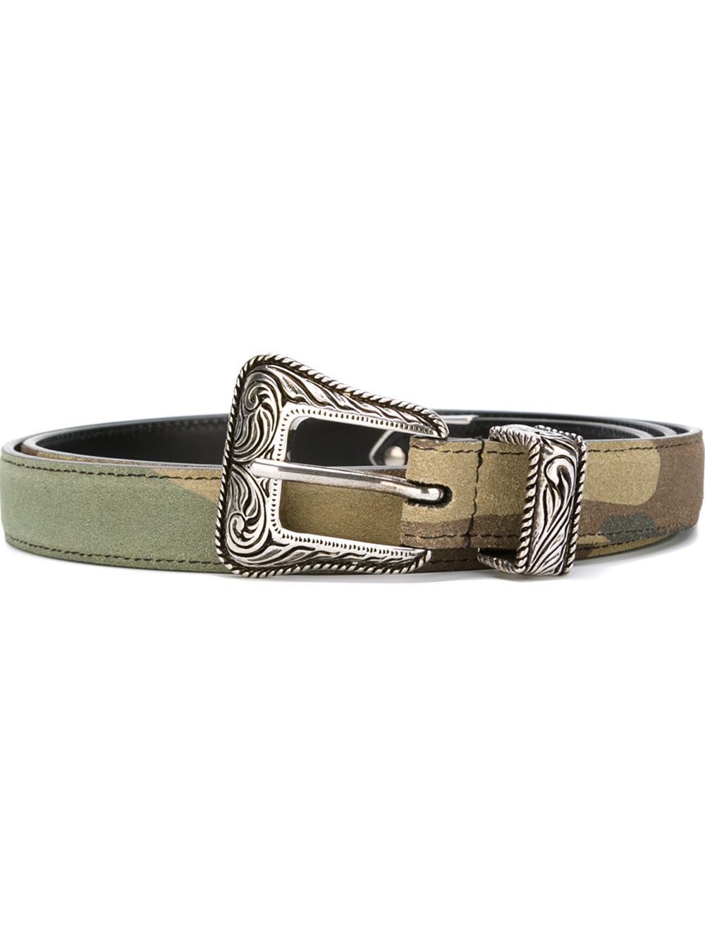 - Saint Laurent 绿色 小牛皮 西部风扣环腰带。 迷彩印花, 银色扣, 可调整松紧。