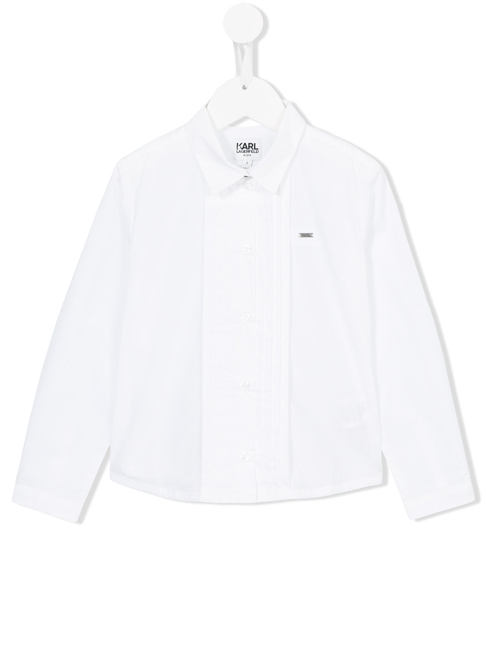 - White cotton pleated placket shirt from Karl Lagerfeld Kids featuring a classic collar, a front button fastening, long sleeves, button cuffs, a silver-tone logo plaque and a curved hem.