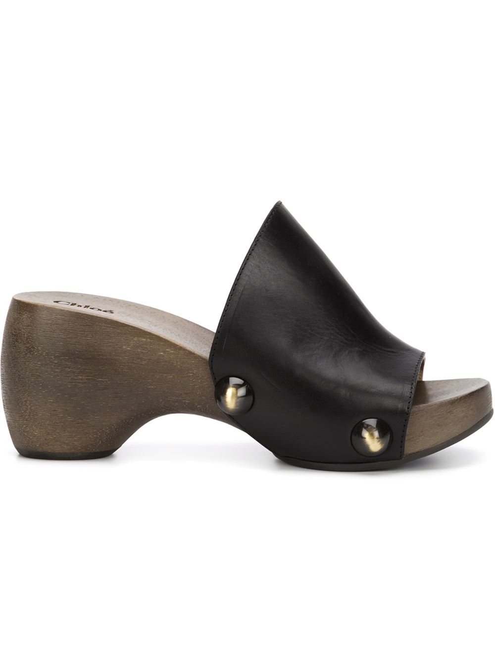 - Chloé 黑色 牛皮与木质 'Izzy'穆勒鞋。 露趾, 鞋垫饰有品牌浮雕, 中跟。