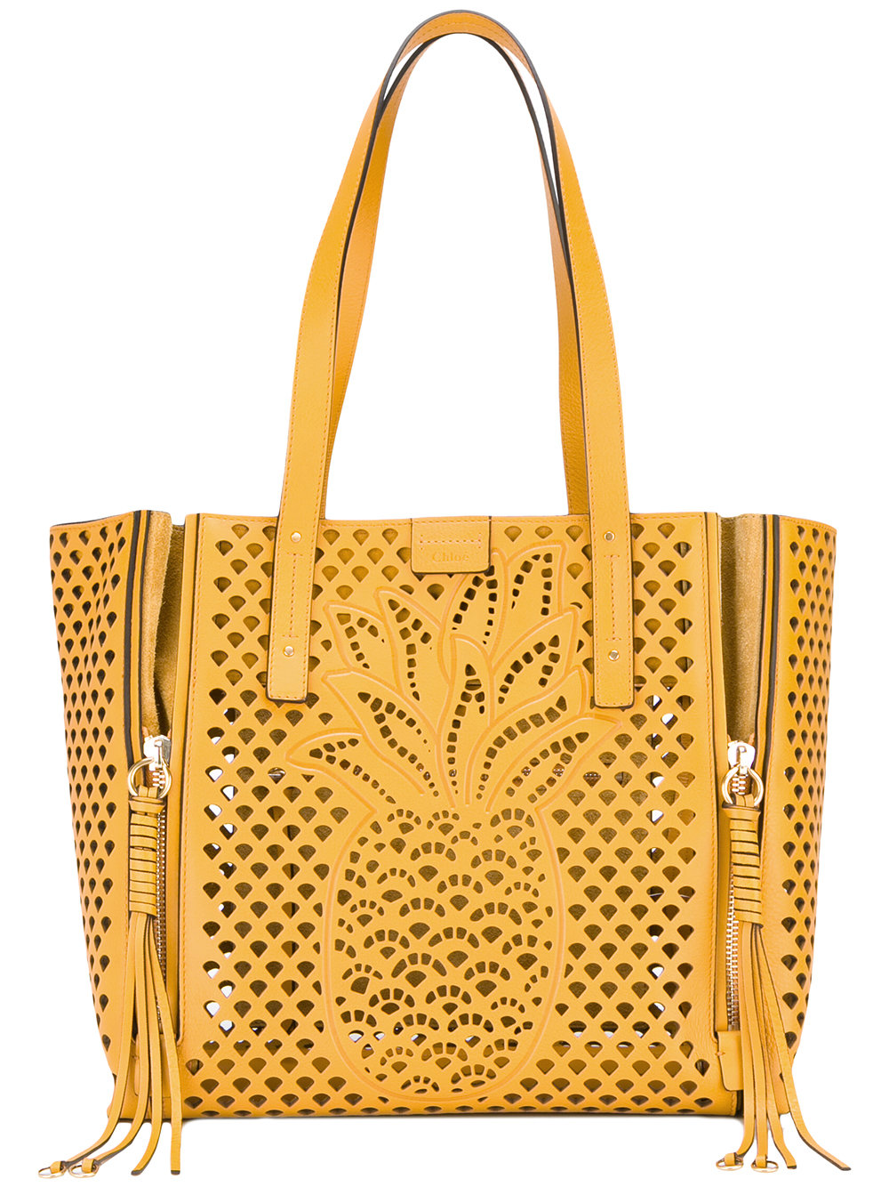 - Sunflower yellow leather and suede pineapple 'Cabas' tote from Chloé featuring a top magnetic closure, side zip details, tassel detailing, a laser cut design, a front embossed logo stamp, an internal zipped pocket and double straps.