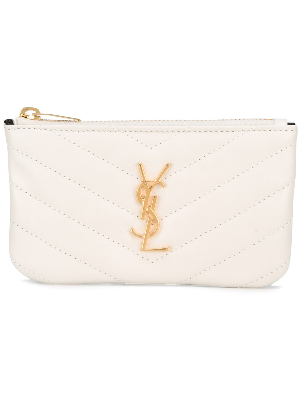 - White leather monogrammed coin purse from Saint Laurent featuring a gold-tone top zip fastening, multiple interior card slots, internal keyring and chevron stitching.