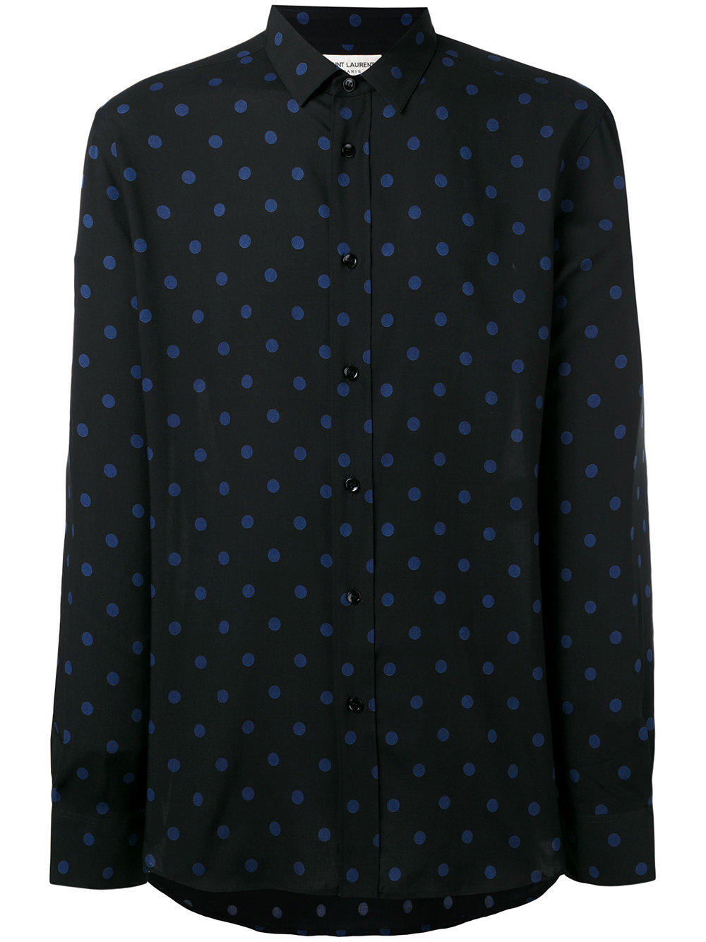 - Black and blue shirt from Saint Laurent featuring a polka dot print and a front button placket.