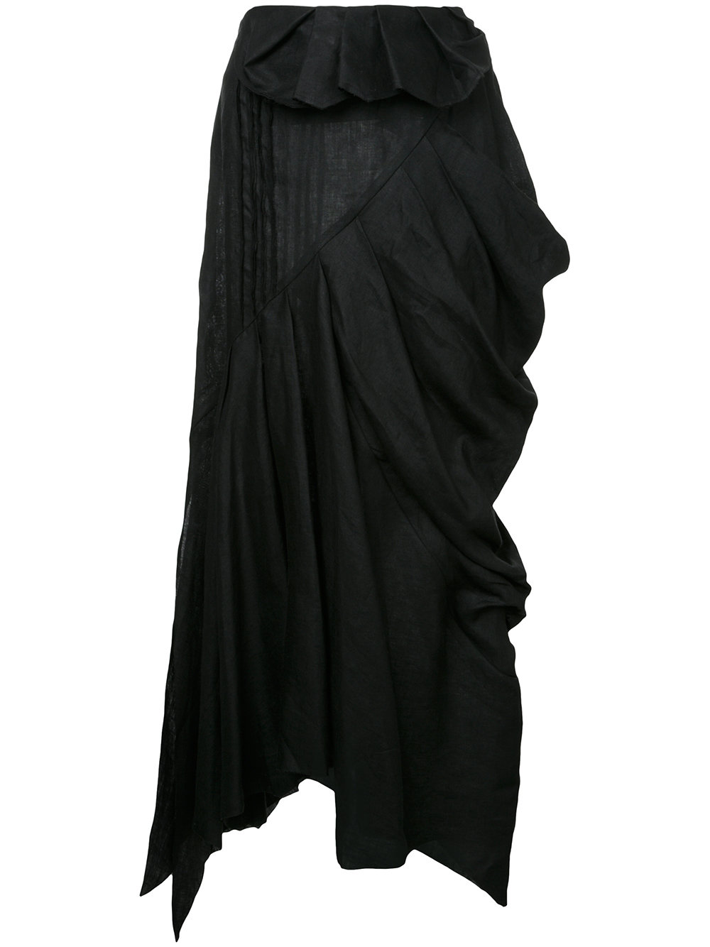 - Black linen draped pocket asymmetric skirt from Aganovich.