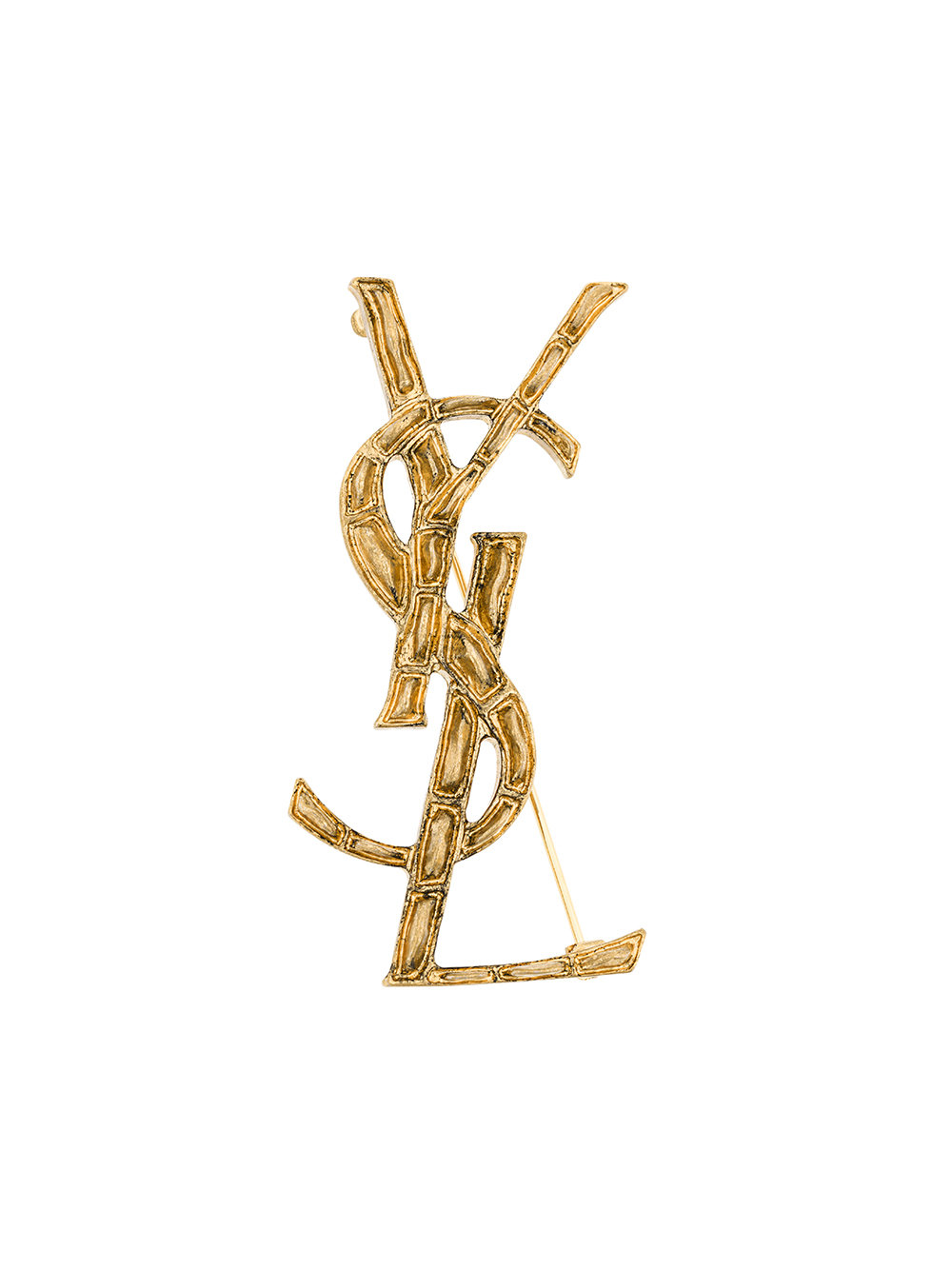 - Gold-toned logo brooch from Saint Laurent featuring a gold-tone logo plaque.