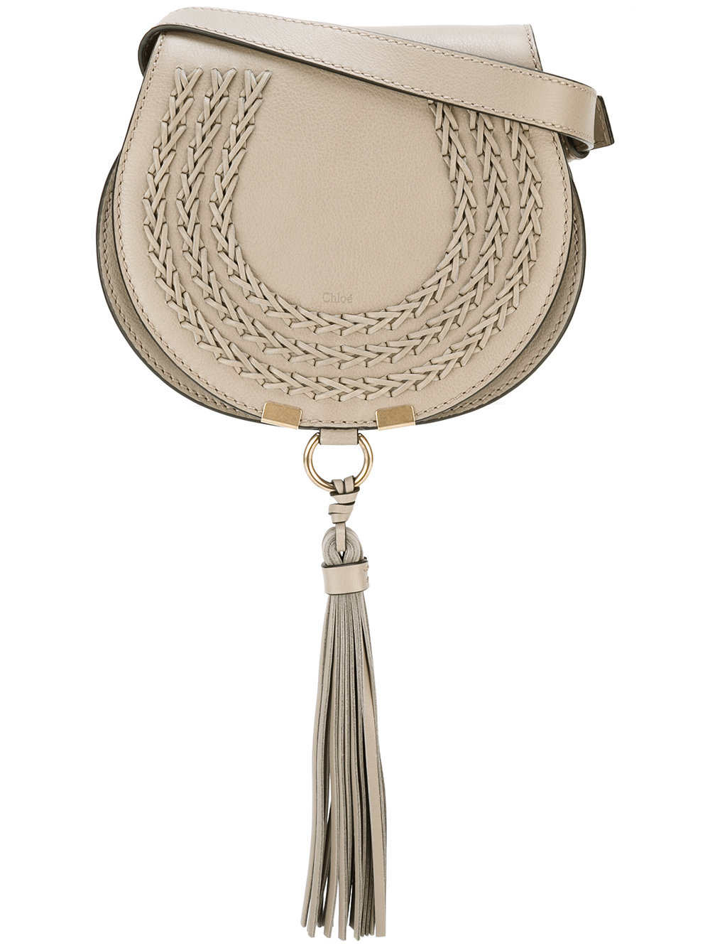 - Motty grey calf suede mini 'Marcie' bag from Chloé featuring a top flap closure, a hanging tassel, a front embossed logo stamp, a suede lining, an adjustable shoulder strap, gold-tone hardware and whipstitch detailing.