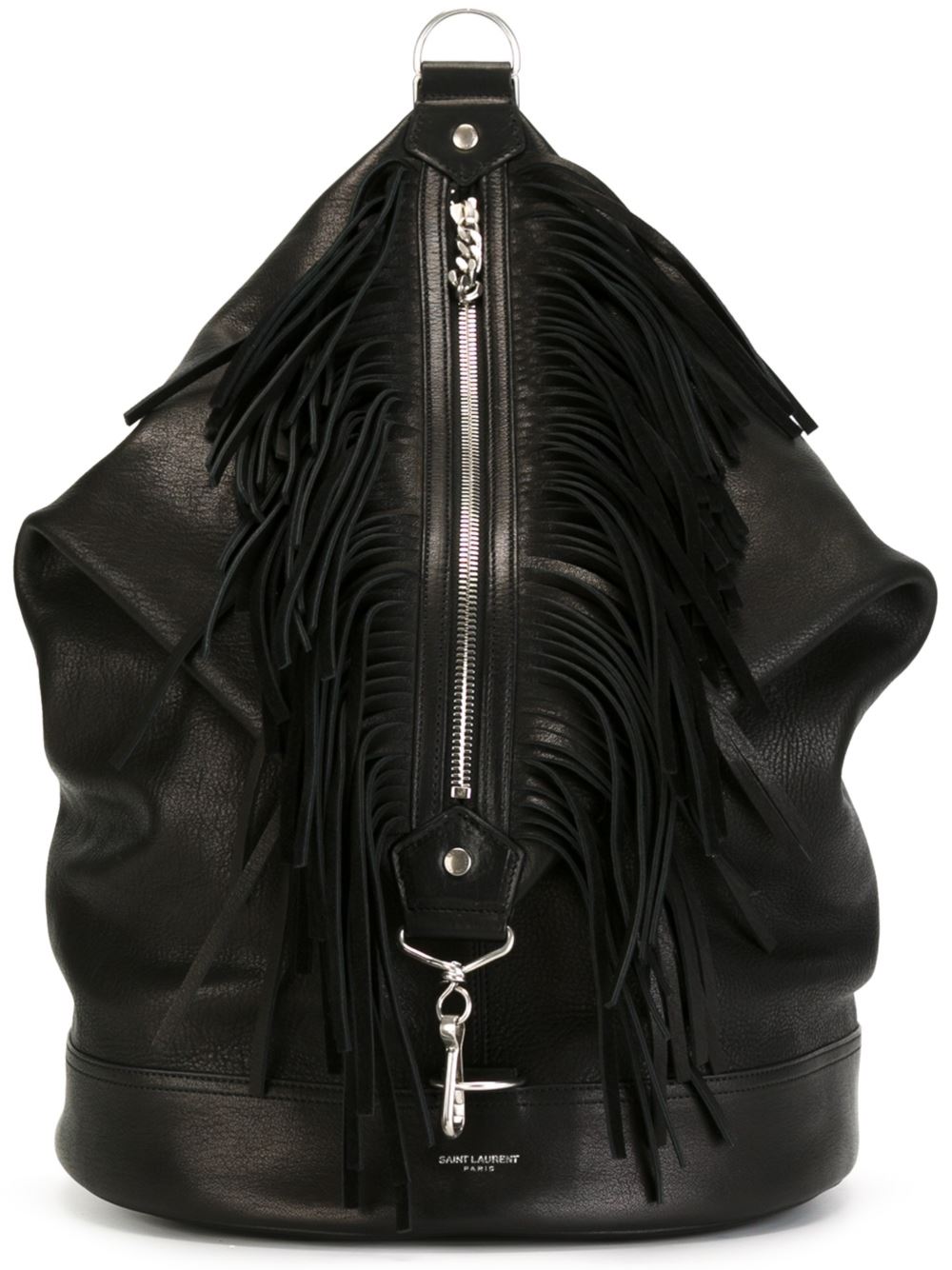 - Saint Laurent 黑色 牛皮 流苏背包。 正面拉链, 银色五金配件, 正面饰有浮雕品牌标记, 流苏细节, 可调肩带, 全衬里, 内置拉链口袋, 内置标牌。