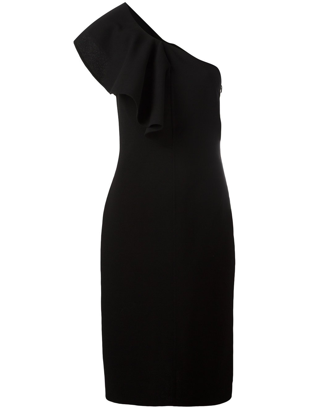- Black virgin wool ruffle trim one shoulder dress from Saint Laurent featuring a concealed side zip fastening, a fitted silhouette, a straight hem, a rear central vent and a mid-length.