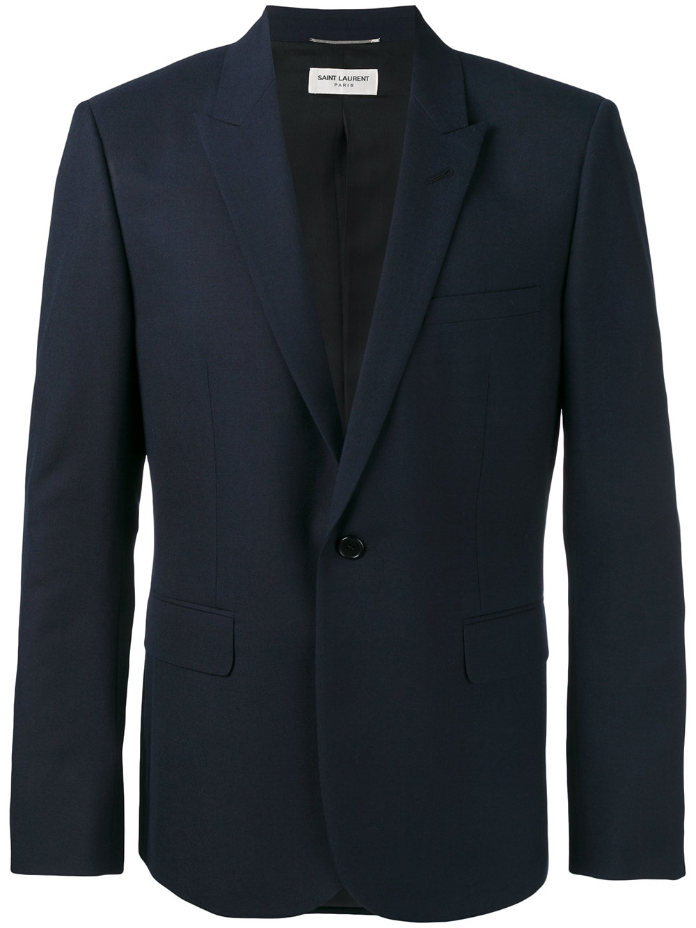 - Dark navy blue wool blend single-breasted blazer from Saint Laurent featuring classic lapels, two front pockets, a button fastening and a chest pocket.