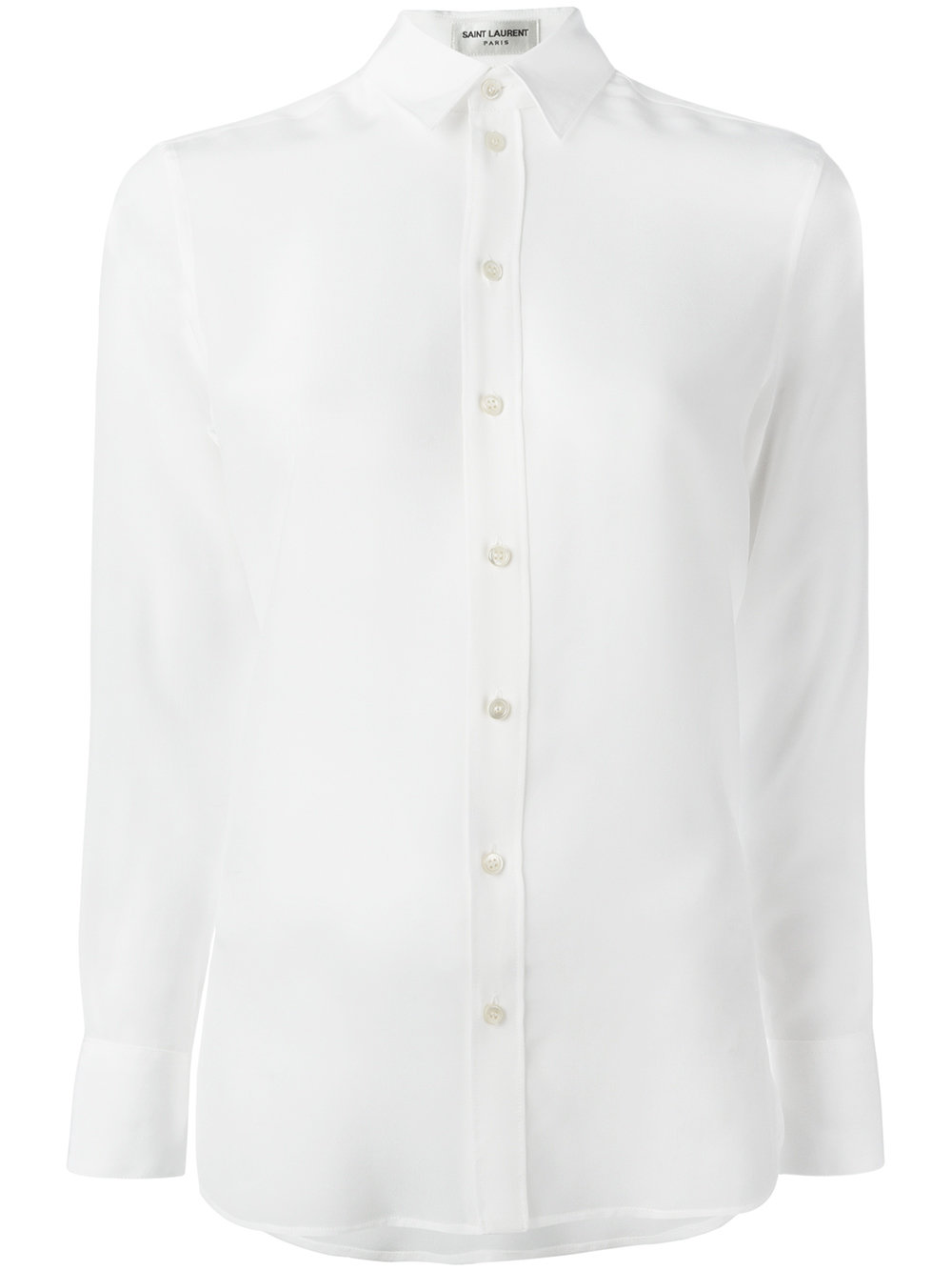 - White silk classic long sleeve shirt from Saint Laurent featuring a classic collar, a front button fastening, long sleeves, button cuffs and a curved hemline.
