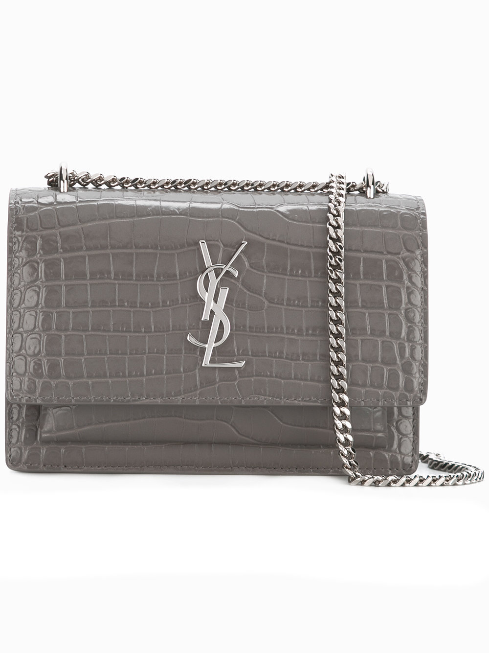 - Grey leather small Sunset Monogram satchel from Saint Laurent featuring an embossed crocodile effect, a front logo plaque, silver-tone hardware, a chain shoulder strap, a back slip pocket, a foldover top with magnetic closure, an internal logo stamp, an interior zipped compartment, multiple interior card slots and an internal slip pocket.