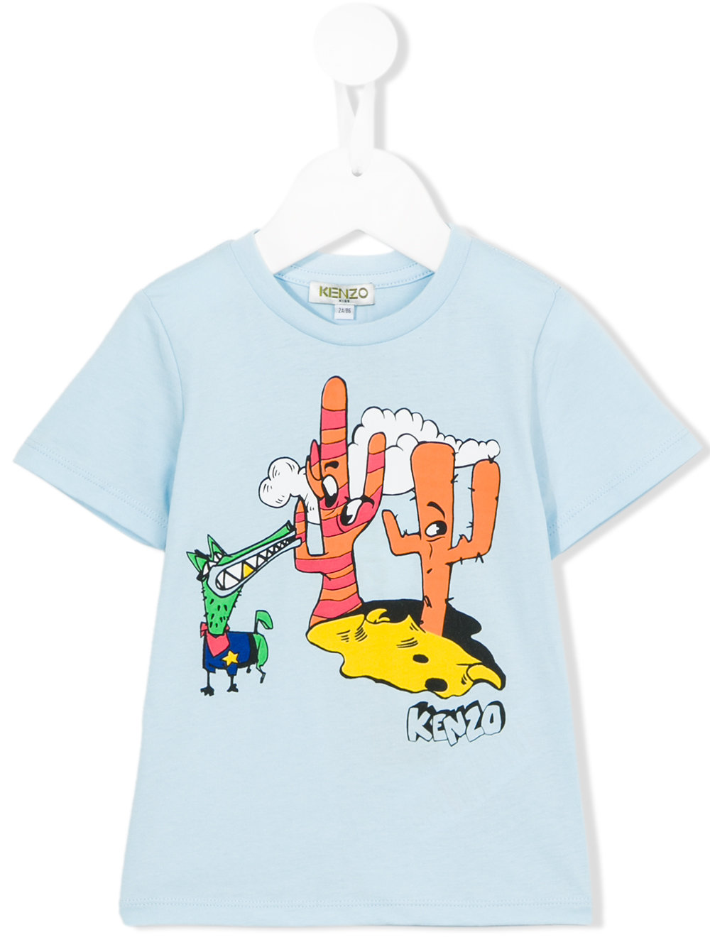 - Pale blue cotton cartoon logo T-shirt from KENZO KIDS featuring a crew neck and short sleeves.