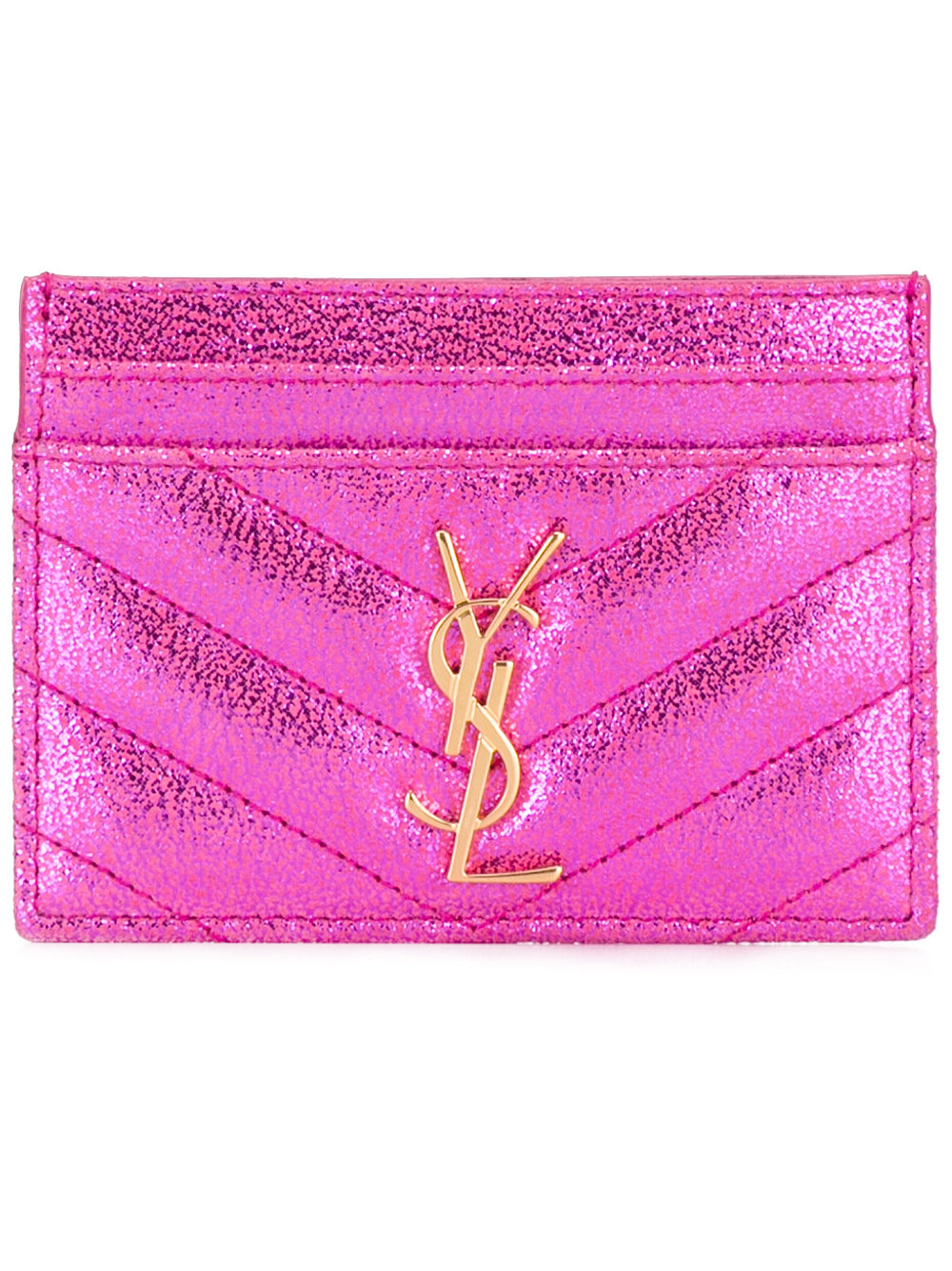 - Metallic pink matelassé leather Monogram credit card case from Saint Laurent featuring a front logo plaque, gold-tone hardware, four card slots and a note compartment.