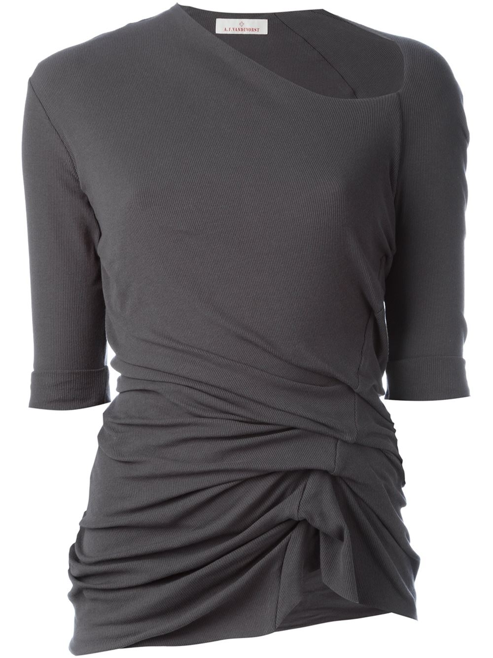 - A.F.Vandevorst 深灰色 弹性棉质 '161 Farbis'上衣。 不对称领口, 七分袖, 褶饰腰, 上翻裤脚。