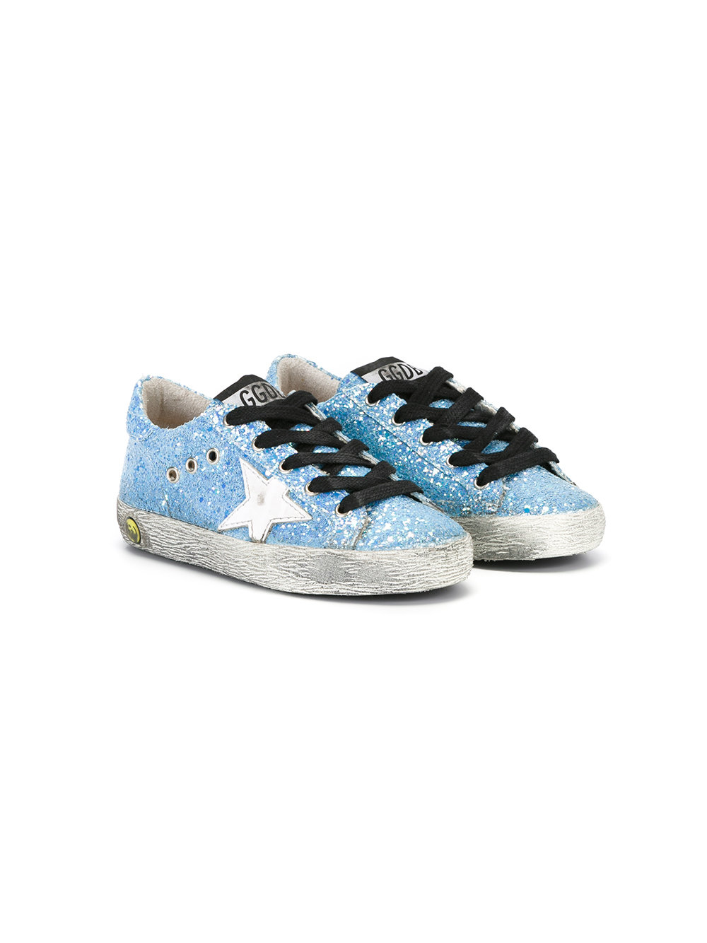 - Blue leather glitter sneakers from GOLDEN GOOSE DELUXE BRAND KIDS featuring a round toe, a lace-up front fastening, a logo patch at the tongue, a branded insole and a white rubber sole.