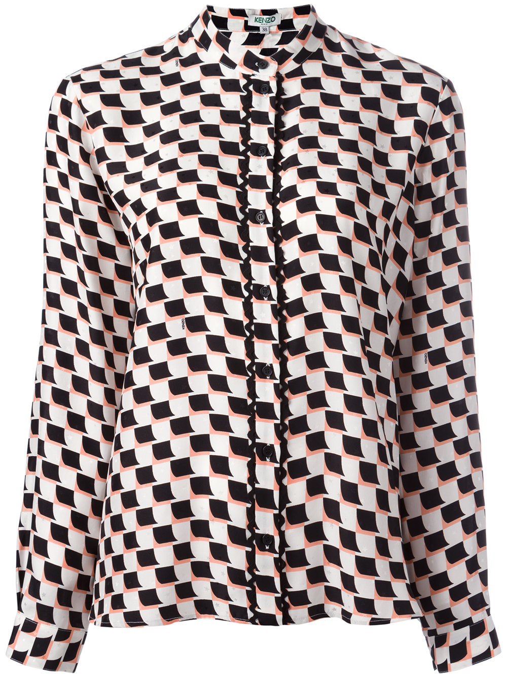 - Black and white silk checkered shirt from Kenzo featuring a round neck, long sleeves, button cuffs, a button down collar and a checkered pattern.