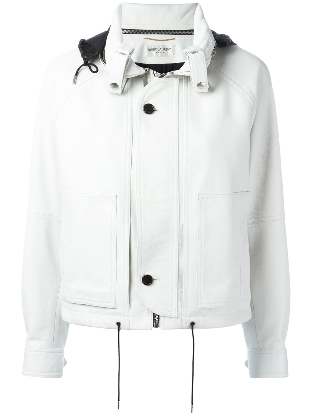 - White cotton and leather hooded cropped jacket from Saint Laurent featuring a stand up collar, a button over front zip fastening, side pockets, long length raglan sleeves, press stud cuffs, a storm flap, a drawstring hem, a full lining and a zipped hood.