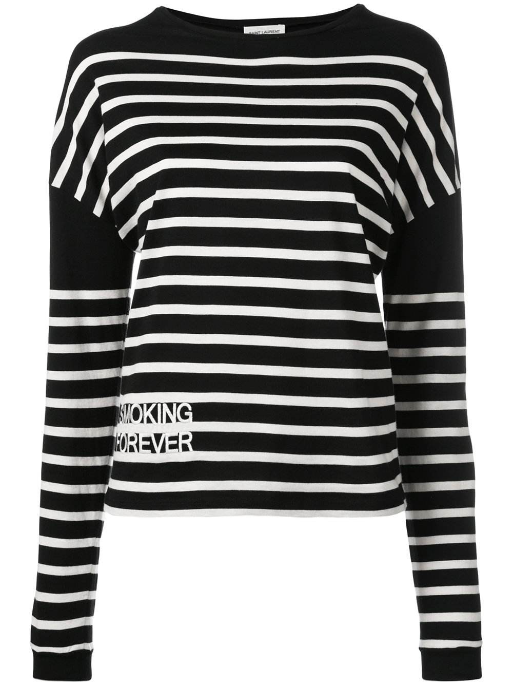 - Black cotton striped jumper from Saint Laurent featuring a crew neck, a striped pattern and text placed at the side.