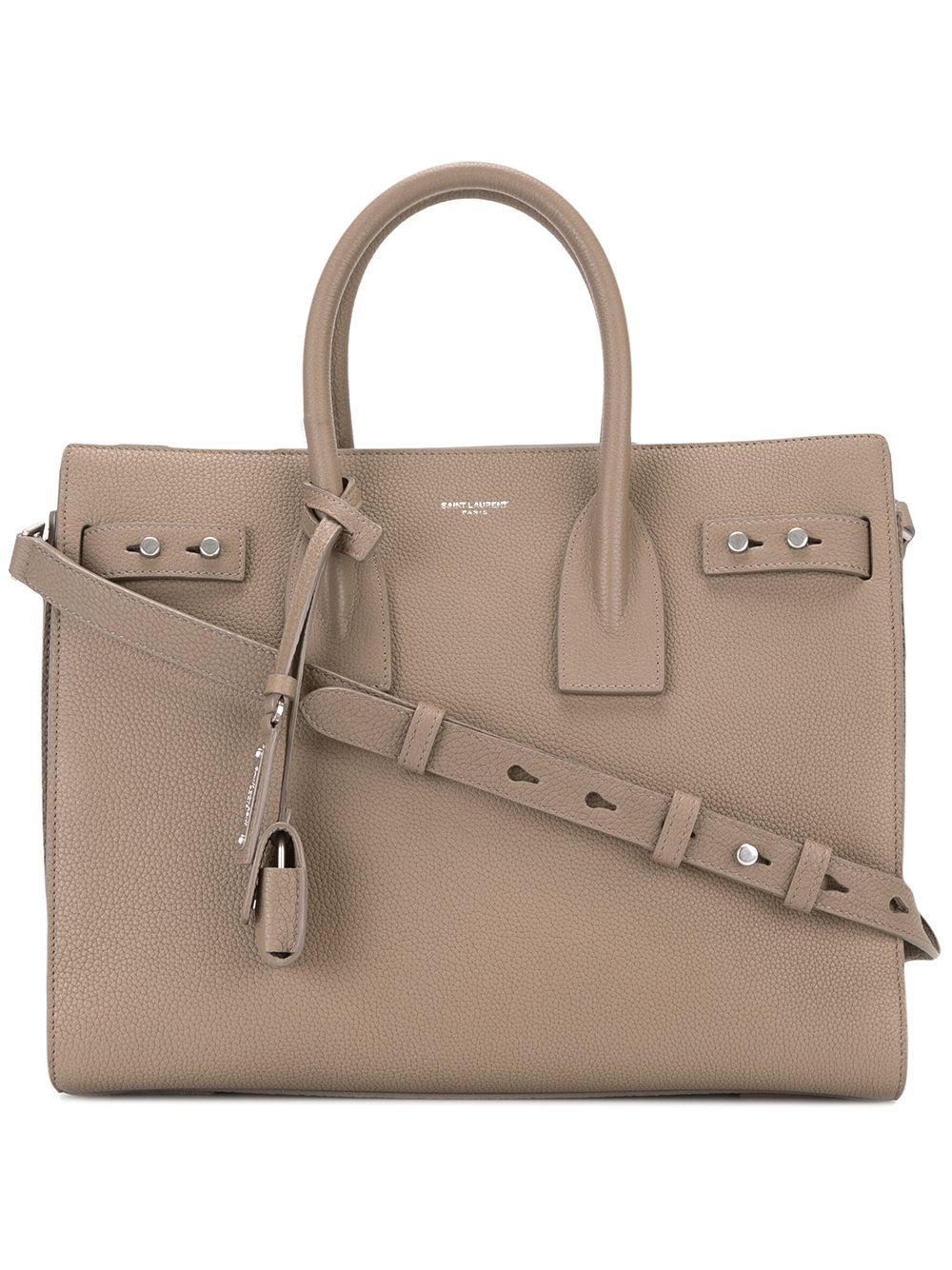 - Light brown leather small Sac de Jour tote from Saint Laurent featuring round top handles, a detachable and adjustable shoulder strap, silver-tone hardware, a front centre logo stamp, accordion details at sides, compression tab to the sides, an open top design, an interior zipped compartment, an internal logo stamp, a suede lining, a hanging padlock fob, a hanging branded leather tag and purse feet.