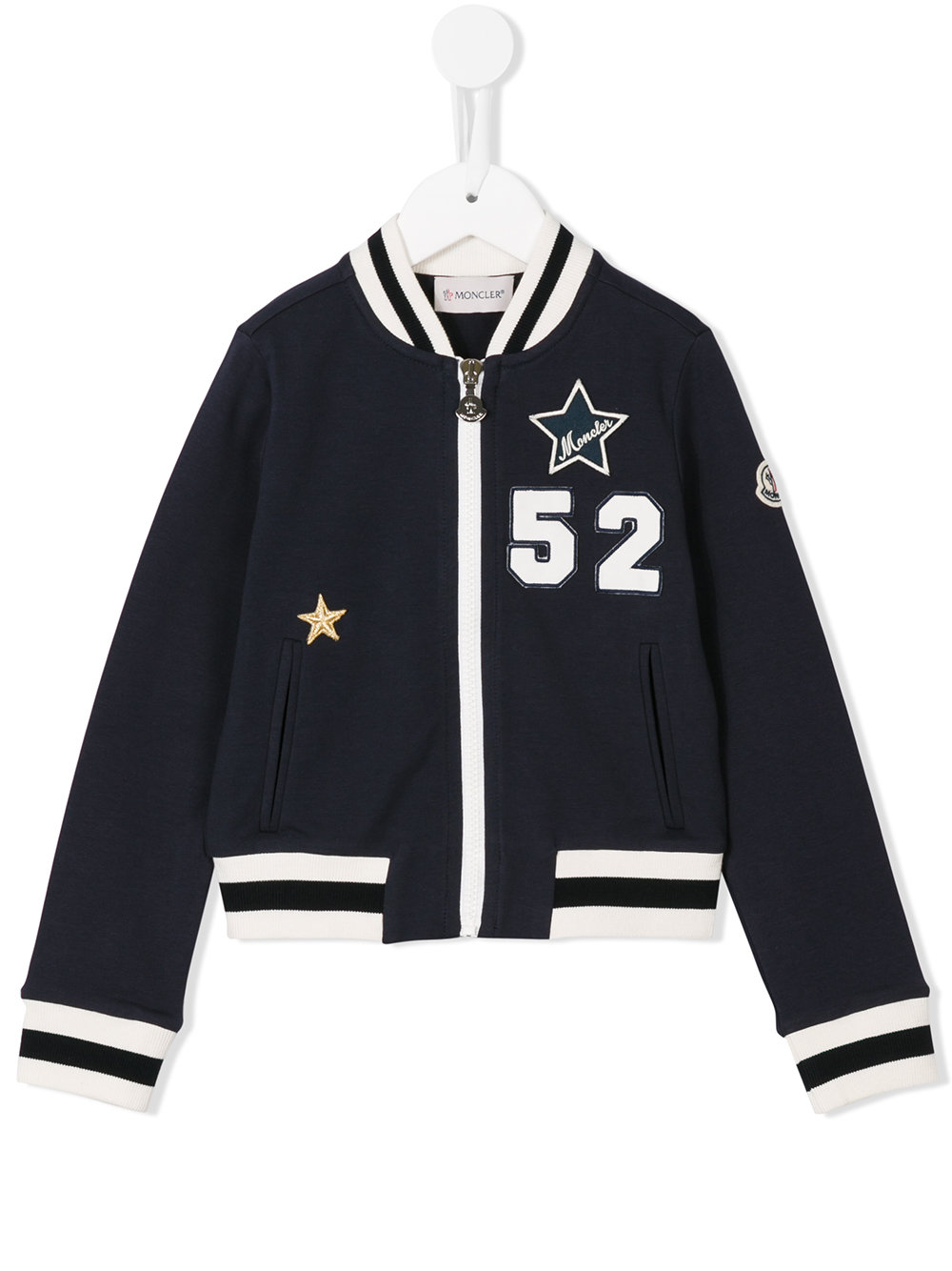 - Blue cotton zipped bomber jacket from MONCLER KIDS featuring a high standing collar, a front zip fastening, long sleeves and a straight hem.