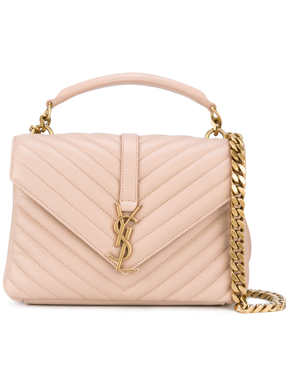 - Saint Laurent (圣罗兰) 裸粉色 牛皮 Monogram小号单肩包。 顶部有一个手柄, 翻盖饰有摁扣, 粗质感皮革, 搭链肩带, 金色标牌, 内置拉链口袋。
