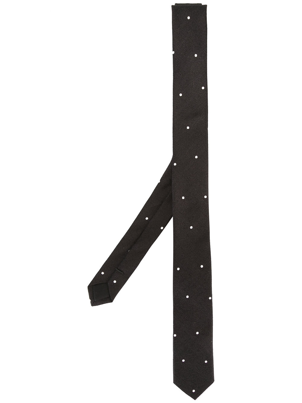- Black and white silk polka dot embroidered skinny tie from Saint Laurent featuring a pointed tip.