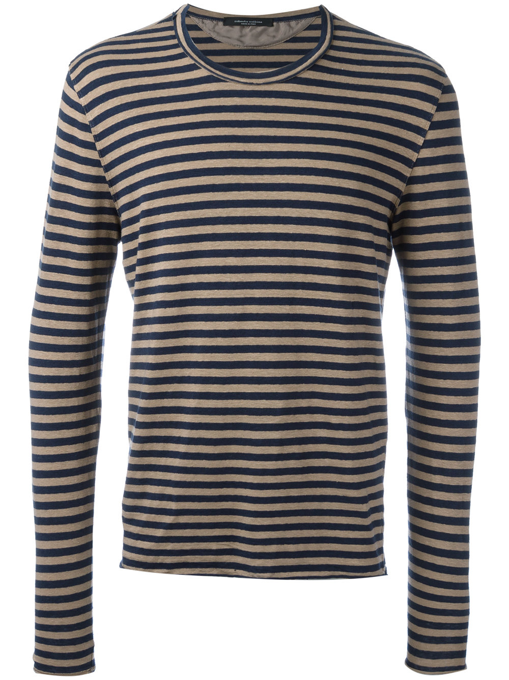 - Roberto Collina 米色与蓝色 亚麻混纺 长袖条纹T恤。 圆领, 长袖, 平直下摆。