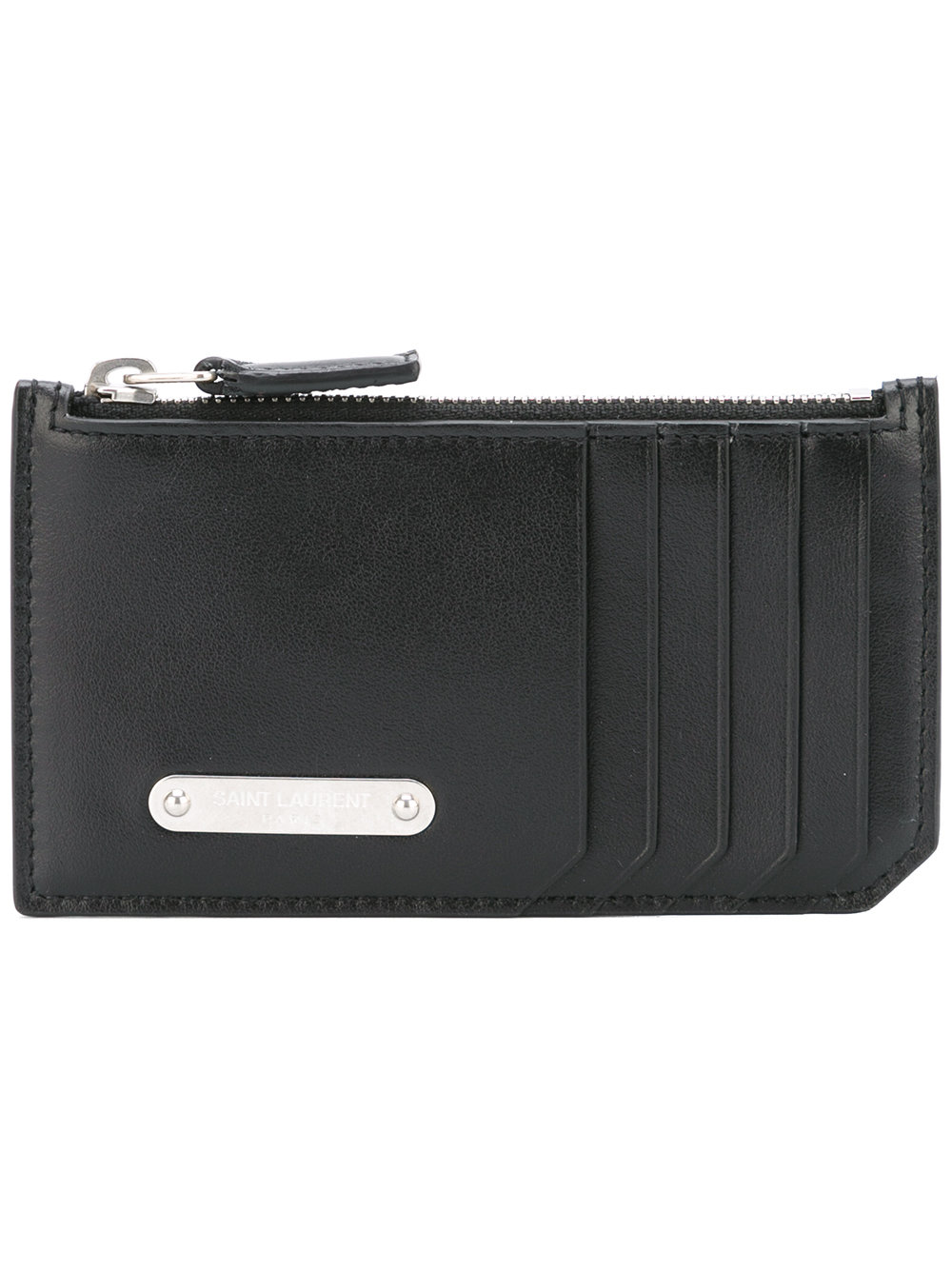 - Black calf leather ID Fragments zip pouch from Saint Laurent featuring a silver-tone logo plaque, multiple interior card slots, a top zip closure and an internal logo stamp.