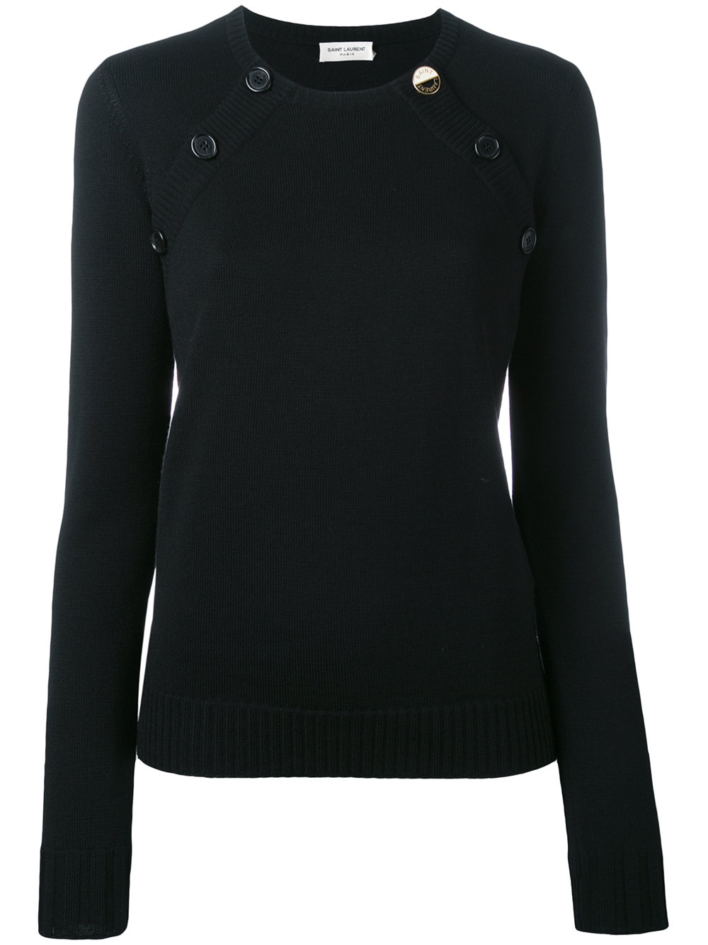 - Black wool sailor double button jumper from Saint Laurent featuring a ribbed round neck, long sleeves, a ribbed hem and cuffs and a single gold-tone logo engraved button.