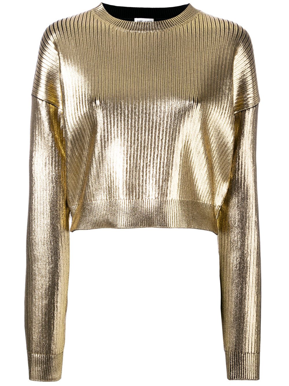 - Gold coated metallic cropped jumper from Saint Laurent featuring a ribbed round neck, dropped shoulders, long sleeves, a ribbed hem and cuffs and a ribbed design.