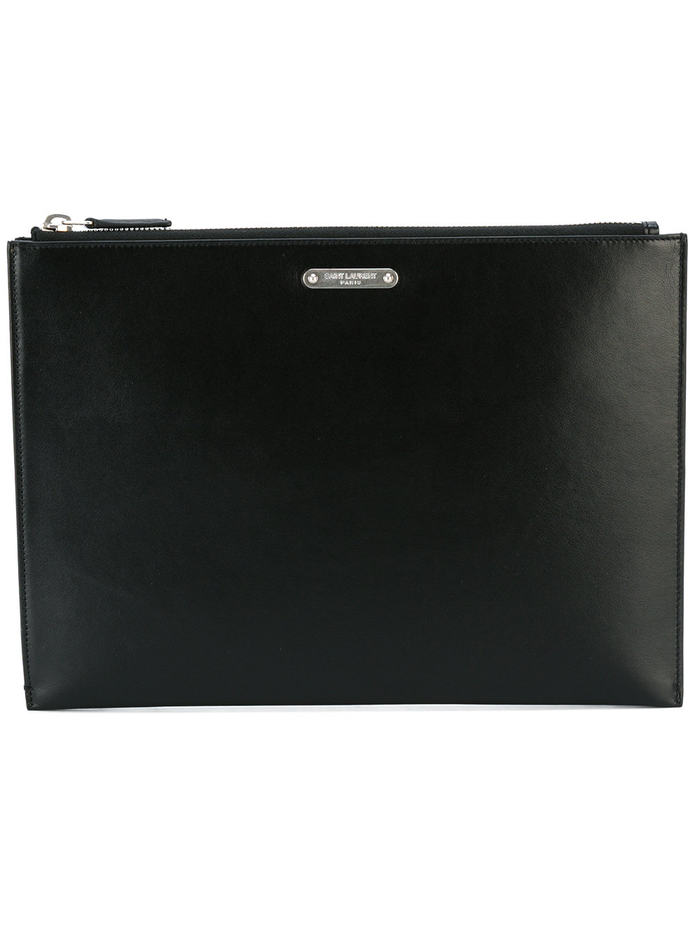 - Black calf leather ID tablet holder from Saint Laurent featuring a silver-tone logo plaque, a top zip closure, a full lining, an internal slip pocket and an internal logo plaque.