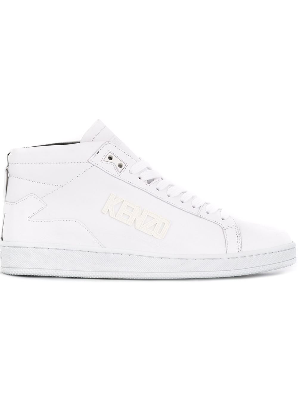 - Kenzo 白色 牛皮与尼龙 'Tenniz'高帮板鞋。 针脚细节, 正面绑带, 圆头, 平底橡胶鞋底。