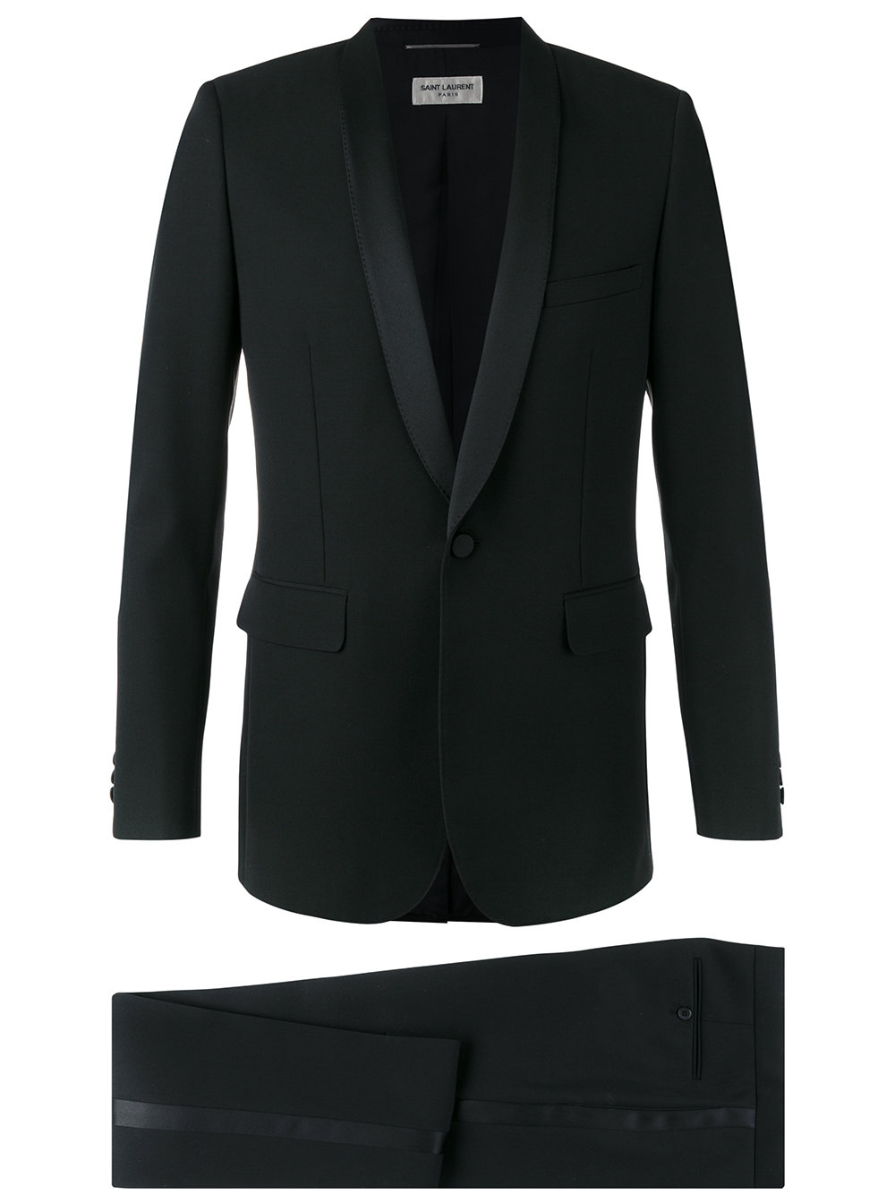 - Black wool formal suit from Saint Laurent featuring a suit jacket with a shawl lapel, front flap pockets and a front button fastening and suit trousers featuring a concealed front fastening, a satin lining and a tailored design.