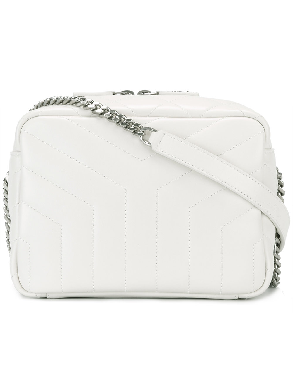 - White Y matelassé leather toy Monogram bowling bag from Saint Laurent featuring a chain and leather strap, silver-tone hardware, a top zip closure, a full lining, an internal zipped pocket, an internal logo plaque, a YSL monogram to one side and monogram zip pulls.