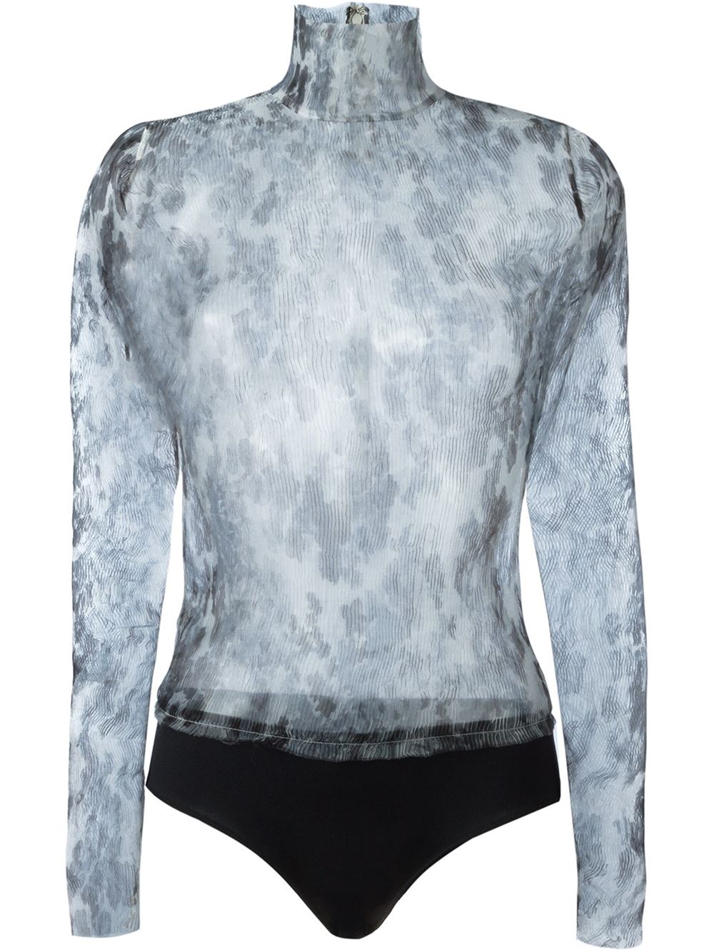 - Yang Li 灰色 丝绸 半透明连体紧身衣。
